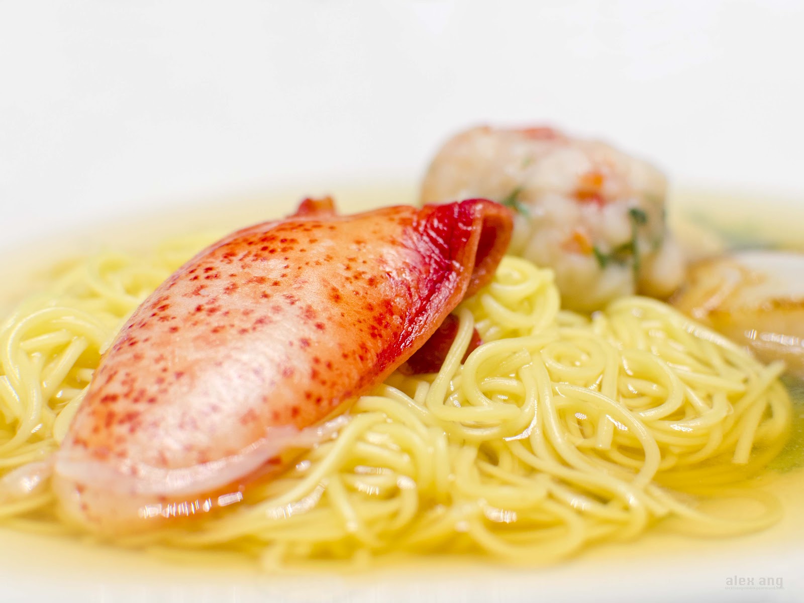 | Egg somen with lobster claw, Hokkaido scallops and shiso leaf-flecked dumpling |