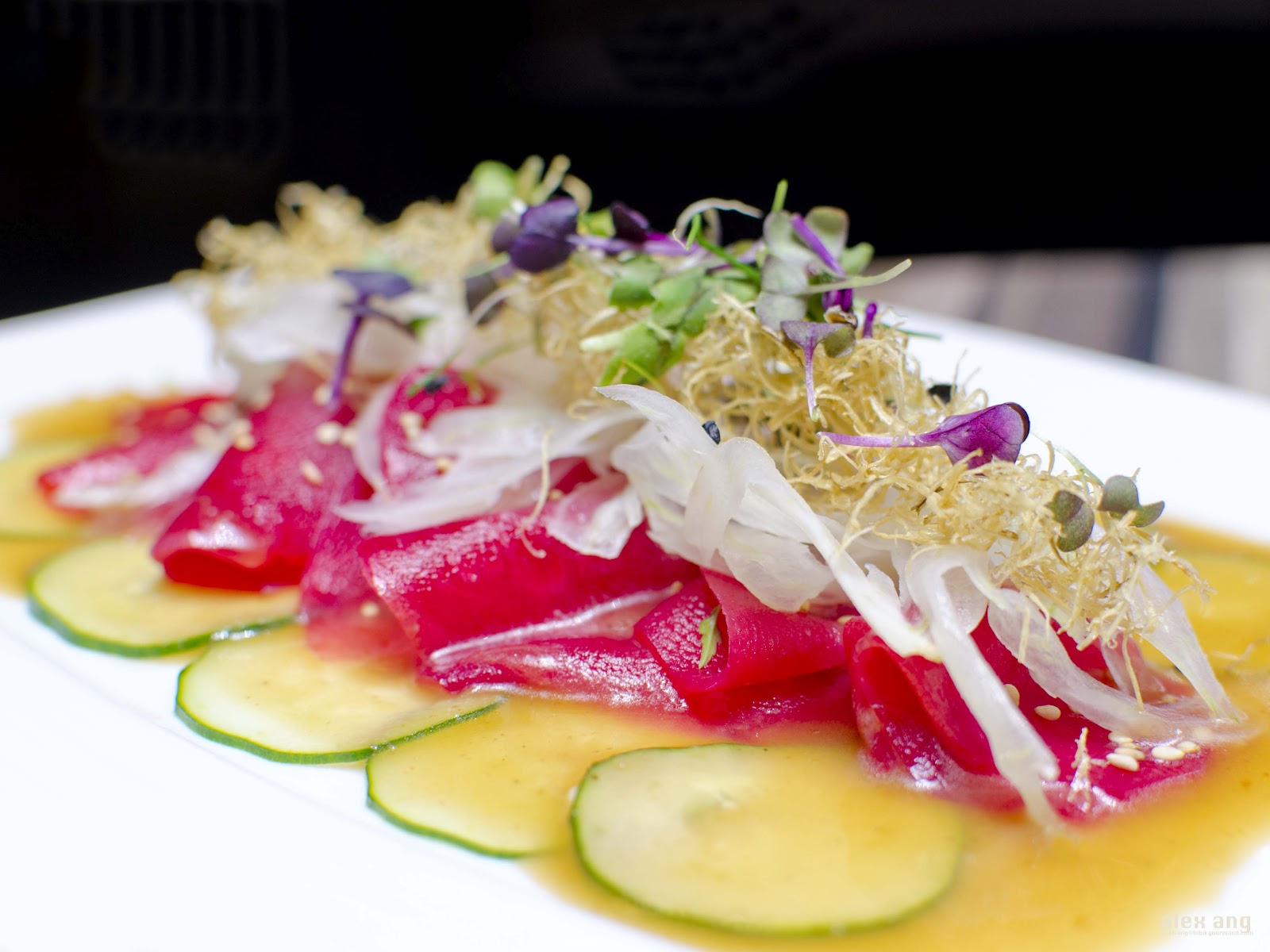 | Beet carpaccio with sliced cucmbers, fennel and chives bathed in a refreshing dressing |