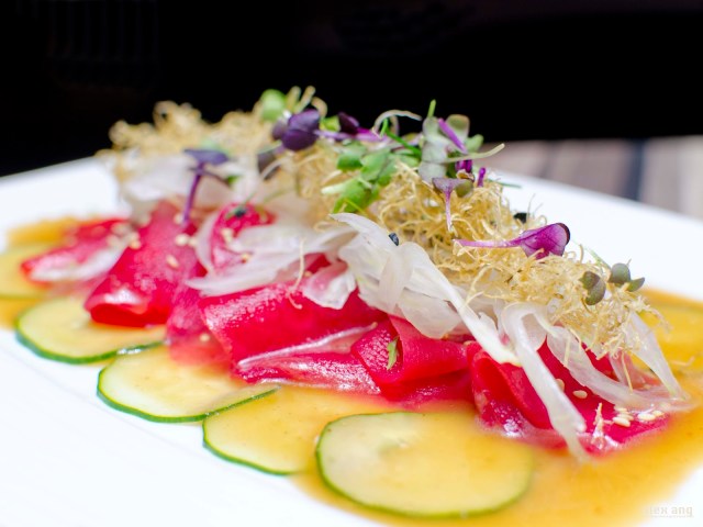 Unlike her flagship restaurant that serves formulaic sushi, sashimi and grilled foods, San Sui dishes up modern, if creative, interpretations of Japanese cuisine that are surprisingly pleasing to the palate. Cubed maguro is marinated with a whisper of sesame and chili oil and served on a bamboo scoop with flecks of sesame seeds and chives ($14), while beet is cooked sous vide, then served as a salad with sliced cucumbers alongside lashings of chives and fennel in a refreshing dressing ($12). The palate pleasers continue with the mains – egg somen is bathed in a savoury dashi broth ($38) flanked by Hokkaido scallops, lobster claw and shiso leaf-flecked prawn dumpling; but the piece de resistance, perhaps even for non-cod lovers, is the sakura leaf-crowned pan-roasted cod ($40) in a pool of aromatic sakura pesto with shimeji mushrooms and a mound of wakame salad. A dinner like this is provides reason enough to swing by Clarke Quay; but if you need another, we suggest the refreshing dessert of umeshu gelee with yuzu sorbet ($14).