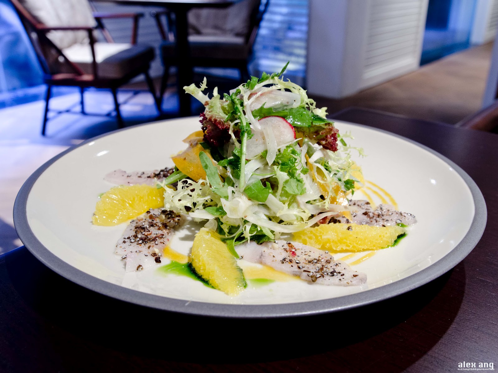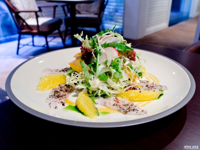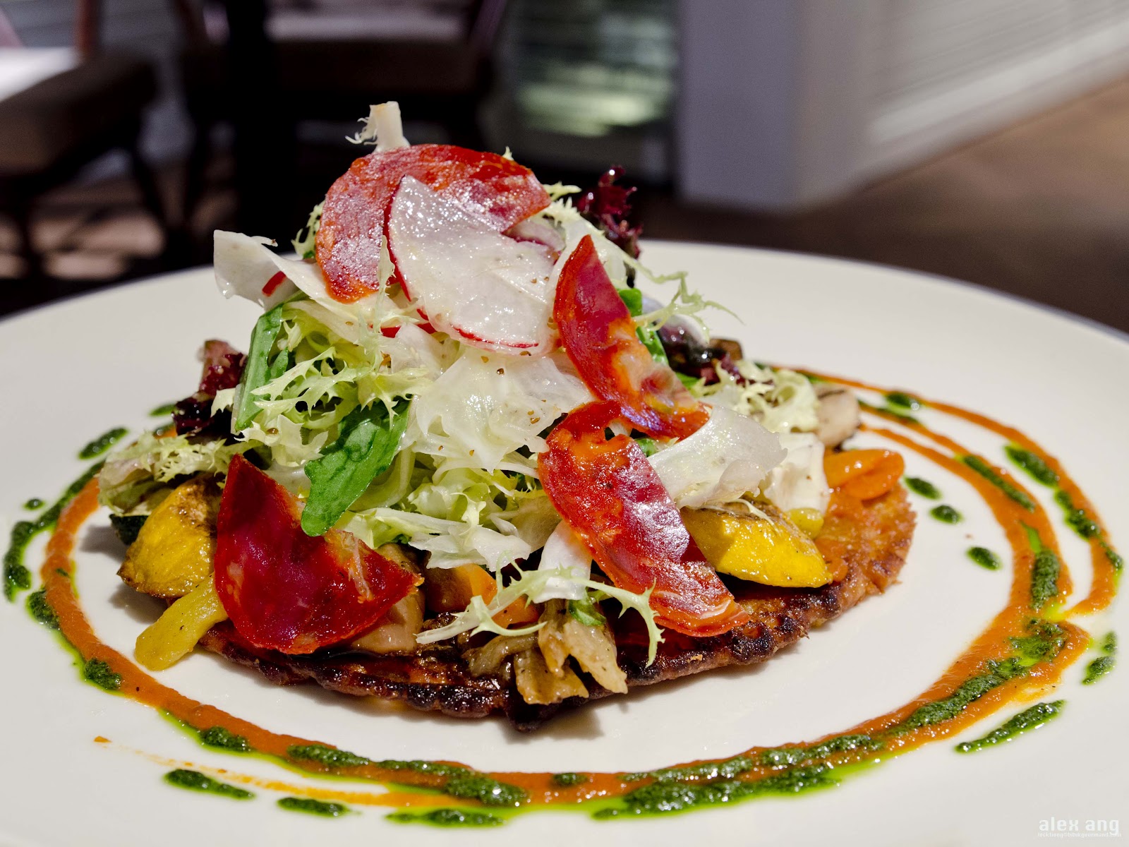 | Socca, chickpea pancake with lashings of vegetables and chorizo slices |