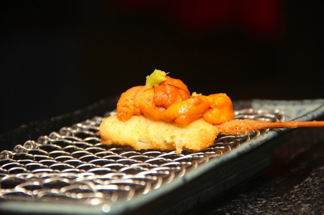 | Kyoto eggplant topped with a tongue of uni |
