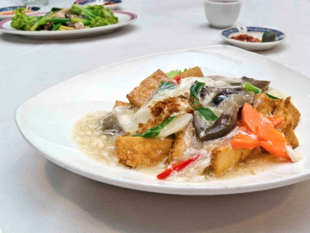 Our braised goose meat ($18 for small) arrived as slim tiles resting on bricks of aromatic firm toufu basking in a fragrant dark brew that fuelled our appetites for more.