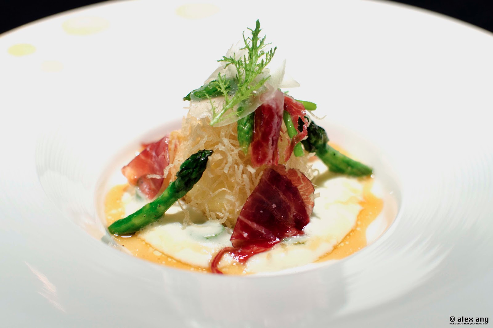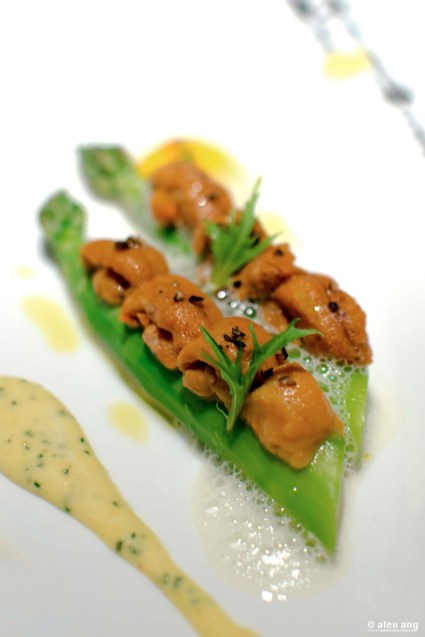 | Cold appetiser: Sea urchin and green asparagus with warm mousseline sauce (Good) |