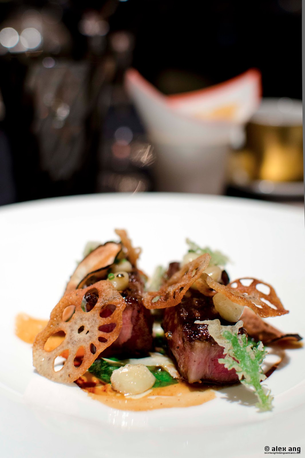 | Mains: Kagoshima beef ribeye with tempura lotus roots and potato fries in vegetable bouillon (Excellent) |