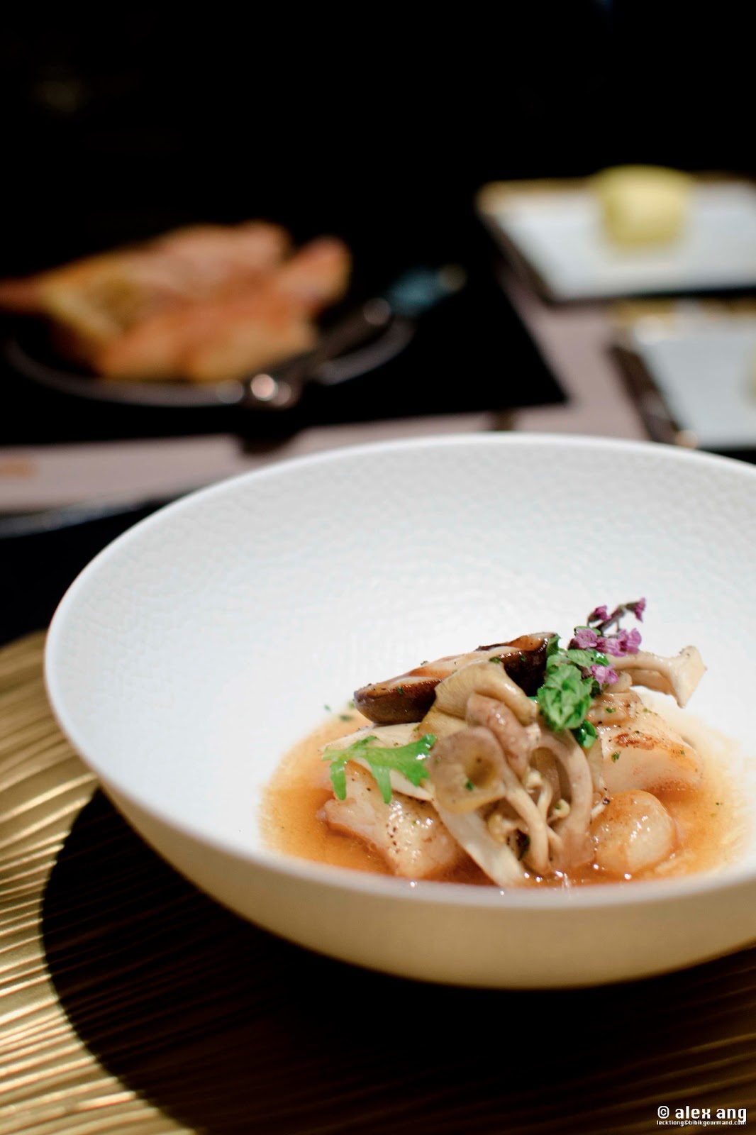 | Mains: Turbot with mushrooms (chantarelle+matsutake) in mushroom-scented pork bouillon (Excellent) |