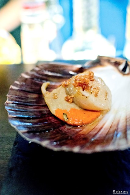 | Lightly grilled diver-caught Atlantic scallop served shell-on complete with roe |