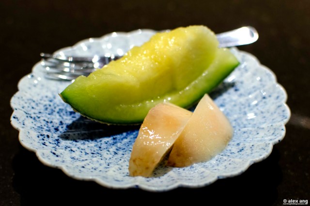 Then a clear dashi-scented broth arrives to arouse your palate. And, you bathe in the glory of Japanese harvests again, an ultra sweet Japanese melon and succulent peaches to wit.