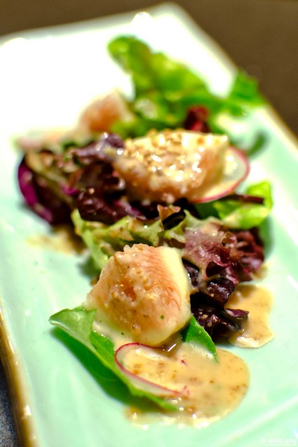 First up, a salad of Japanese figs doused in a nutty-creamy goma dressing to tease your palate, followed by a plate of thinly sliced white fish – an amberjack sashimi during our visit – artfully arranged on a plate with shiso flowers and summer truffle shavings, finished with a drizzle of truffle oil.