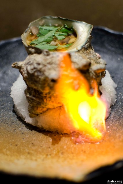 Then Tan fires up his grill and sends out an immaculate delicacy of horned turban (or sazae in Japanese). The prized sea snail is first grilled then chopped and tossed with Japanese fish cake and mushrooms in dashi broth. Served in its own shell on a cake of salt with a flickering flame on the side, it wins plaudits as much for showmanship as for its delicate taste balanced against a tinge of chewiness from the cut-up treasures.