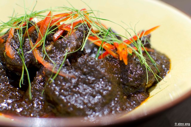 Beef short rib with buah keluak (S$24), a Lee signature since the debut of Candlenut Kitchen, is a perfect example of the young chef’s vision. Lee takes a slab of 120-day grain fed beef short rib and slow cooks it via sous-vide until it’s fall-off-the-bone tender. Served smothered in deliriously delicious buah keluak puree, this dish may be atypically Peranakan but no one can deny its allure nor its Peranakan pedigree.