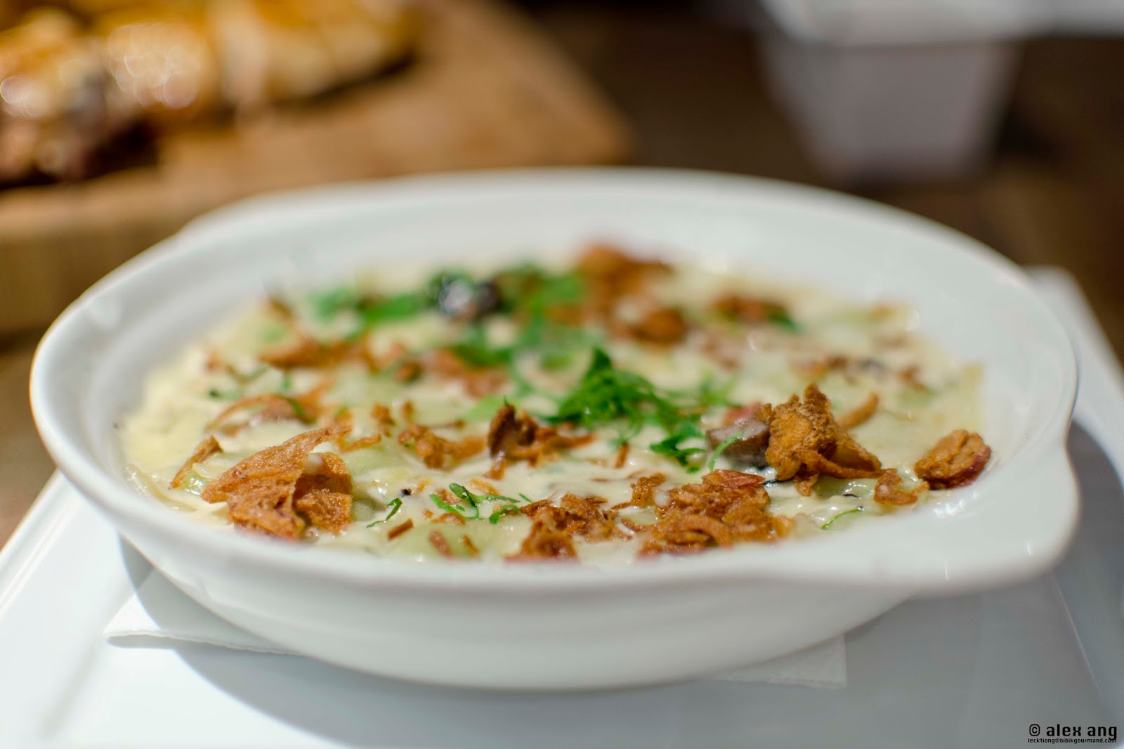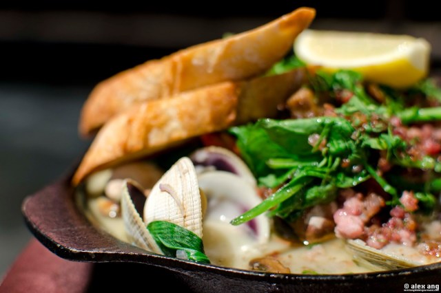 Equally hearty is the seafood alternative of New Zealand little neck clam (S$22 for appetiser, S$32 for mains) served simmering on a hotplate with garlic pork sausages, mushrooms, spinach and lashings of chopped parsley in a heavenly garlic-infused white wine broth.