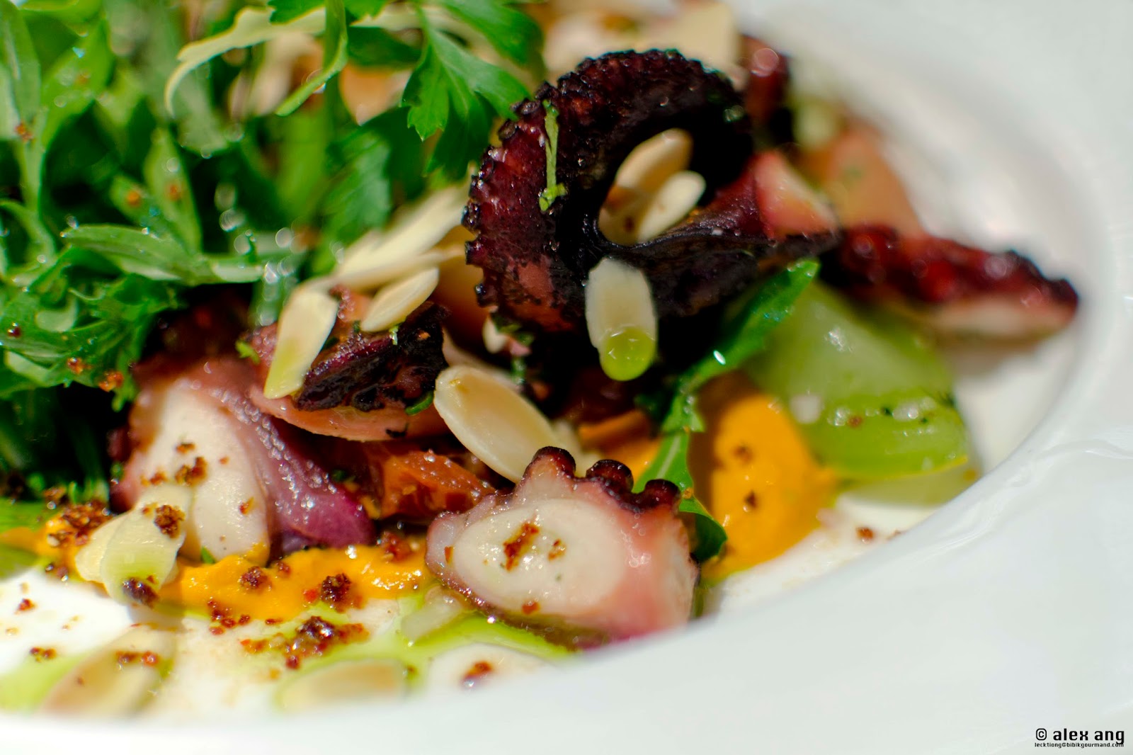 | Char-grilled octopus salad with confit of tomatoes and almond chips in ruddy-coloured Romesco coulis |