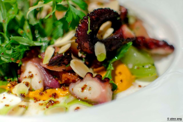If you rather save the protein load for later, the Spanish-inspired starter of char-grilled octopus salad (S$24) is equally sumptuous. The octopus is first cooked via sous-vide for 5 hours, then smoked, char-grilled upon order and tossed in a heap of arugula leaves with confit of tomatoes and almond chips. Served in a thick Romesco coulis perfumed with multiple ingredients including bell peppers, it brings a rich and savoury vibrancy to an otherwise light dish.