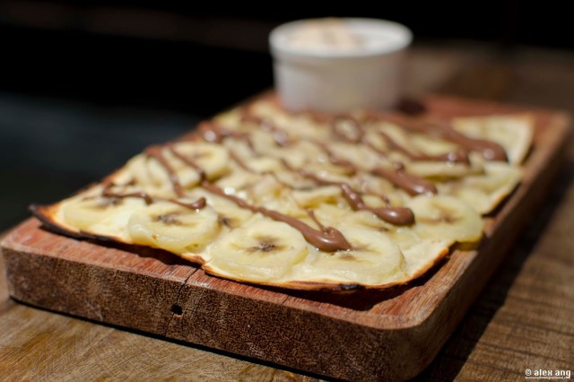 Our sentiments towards the desserts are less enthusiastic. Mom’s recipe apple pie served with milk ice cream (S$12) has a lovely crumbly texture but its sweetness fails to measure up. The banana and nutella cream tart flambee (price not available), is also let down by a limp crust although the flavours are pitch perfect.