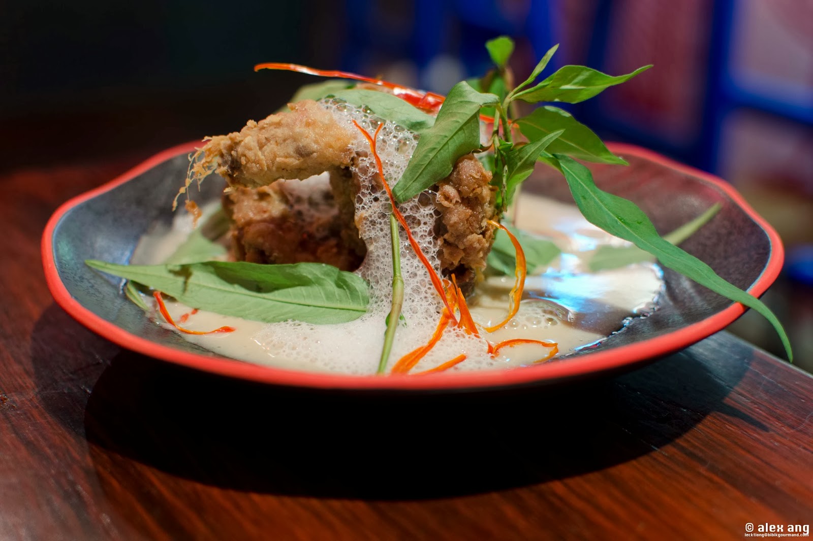 If you cannot resist Thai tom kha, a coconut milk-based broth infused with galangal, lemongrass and kaffir lime leaves, don’t miss the crispy quail basking in an intoxicating reduced tom kha broth (S$23). Yes, there’s barely adequate broth to be slurped but there’s just enough clinging on to the crisp quail’s meat to leave you begging for more.