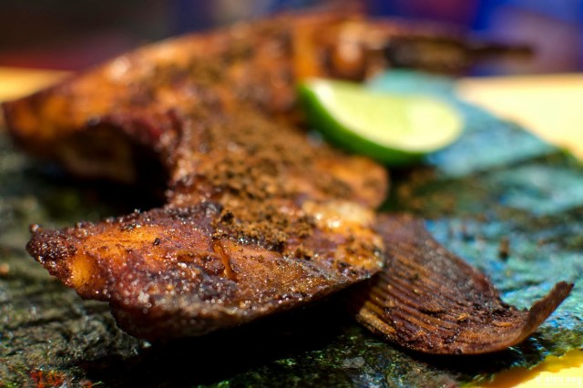 | Carbon-dusted lemon sole with red curry marinade and corianger mayo |