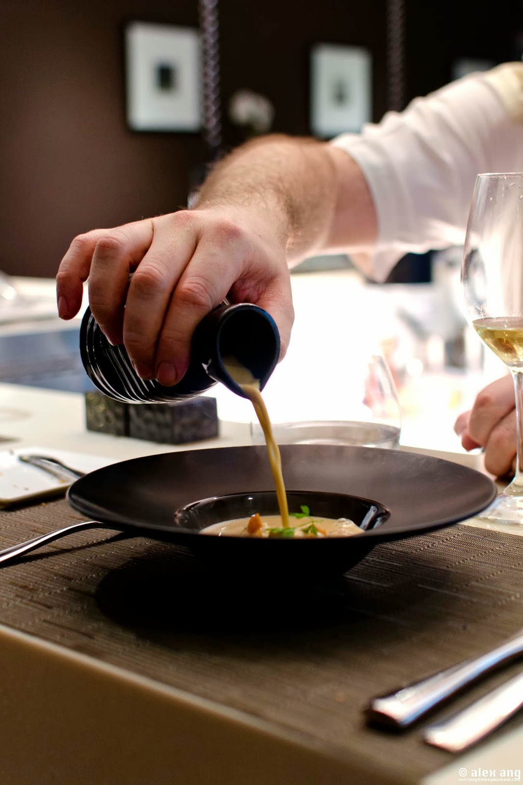 Sited next to the gloriously Paris-esque Brasserie Gavroche (and directly opposite Café Gavroche) by fellow French chef, Frederic Collin, the 35-seat Fleur De Sel’s setting is decidedly low-key – save for a beautiful bar and a handful of dark brown-toned wall-hugging cupboards, the white-and-brown space is relatively unadorned. Still, it packs-in a variety of seating options: a 5-seat bar counter, a 6-seat kitchen counter if you want to watch the chefs cook, the main dining room and a chandeliered private dining room for 12.