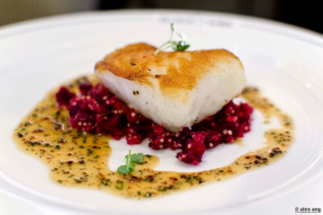 | Grilled seabass with roast beetroot, quinoa and bacon veloute |