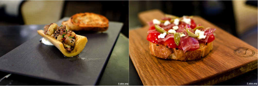 | Baked bone marrow with kombu and chilli (left), toast with cherry tomatoes, jamon iberico and feta cheese (right) |