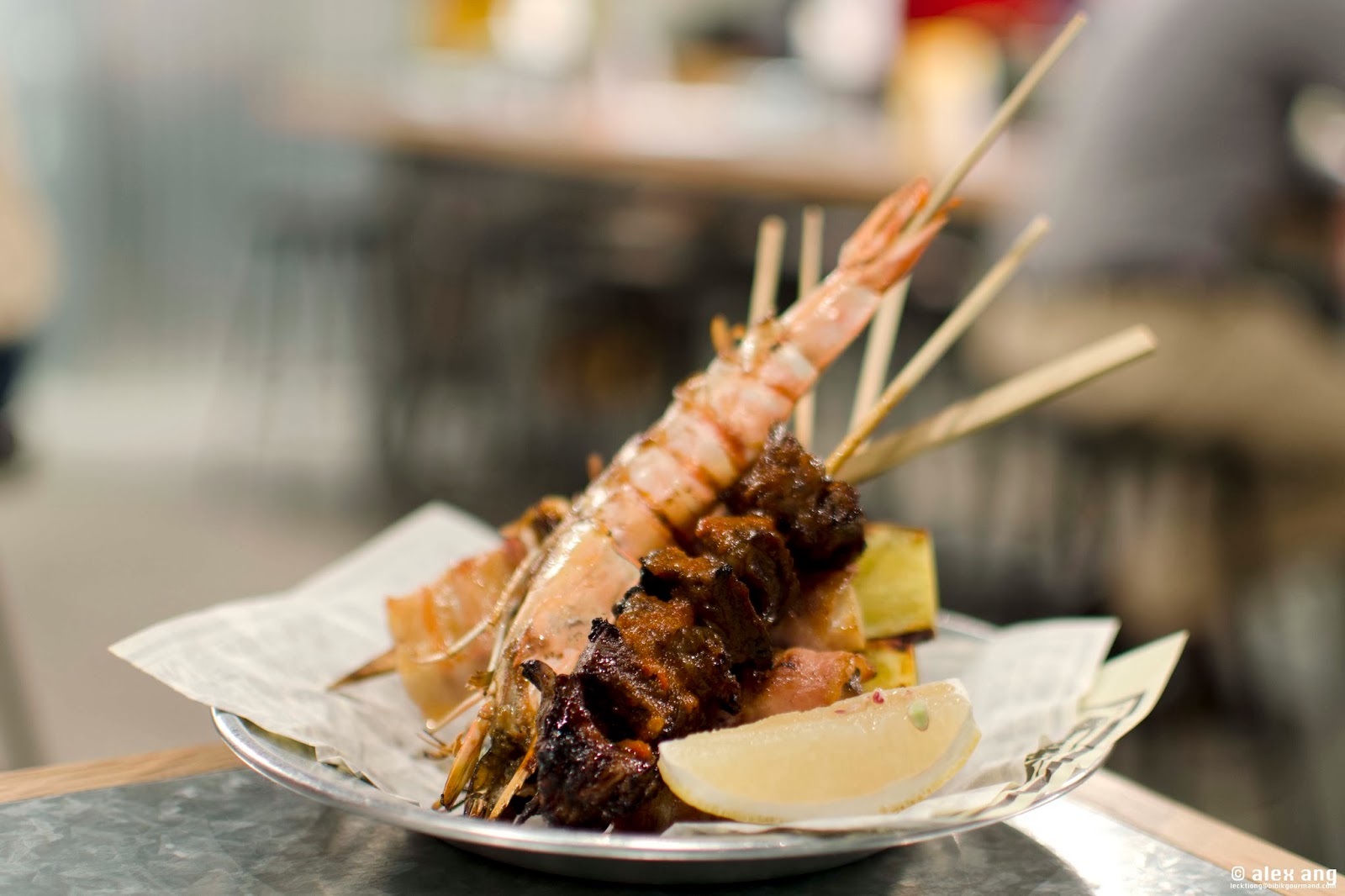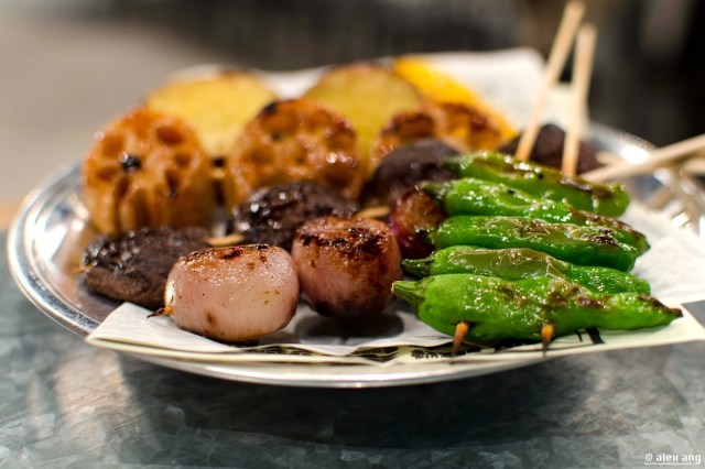 The char-grill menu has options aplenty ranging from beef (S$4), pork belly (S$4), cod fish (S$6) to beef-wrapped foie gras (S$9) and the works. We suggest the assorted skewers (S$23) for the daily-changing array of char-grilled items (including 2 vegetables) from the menu – think a mixed plate of prawn, spicy beef tendons, pork belly, bacon-wrapped eringi mushrooms, sweet potato and sweet corn, all of which pass muster. Augment these with an order of grilled skewered vegetables (off menu item, price not available) basted with chicken oil and a secret chicken stock. The mélange of shishito peppers, shitake mushroom, sweet corn, sweet potato and onions is an agreeable medley.