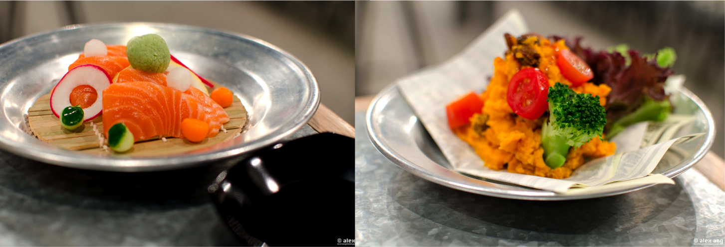 | Salmon sashimi (left), sweet pumpkin salad (right) |
