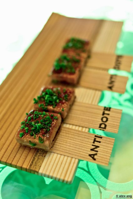 So when we graced the newly debuted Anti:dote on the ground floor of Fairmont hotel where we were greeted by a glitzy bar counter, a gargantuan 26,000-piece Borosilicate glass chandelier and cool glass standing tables, we did not quite expect our pre-dinner cocktail tasting to steer right into dinner paired with cocktails.