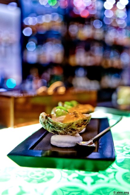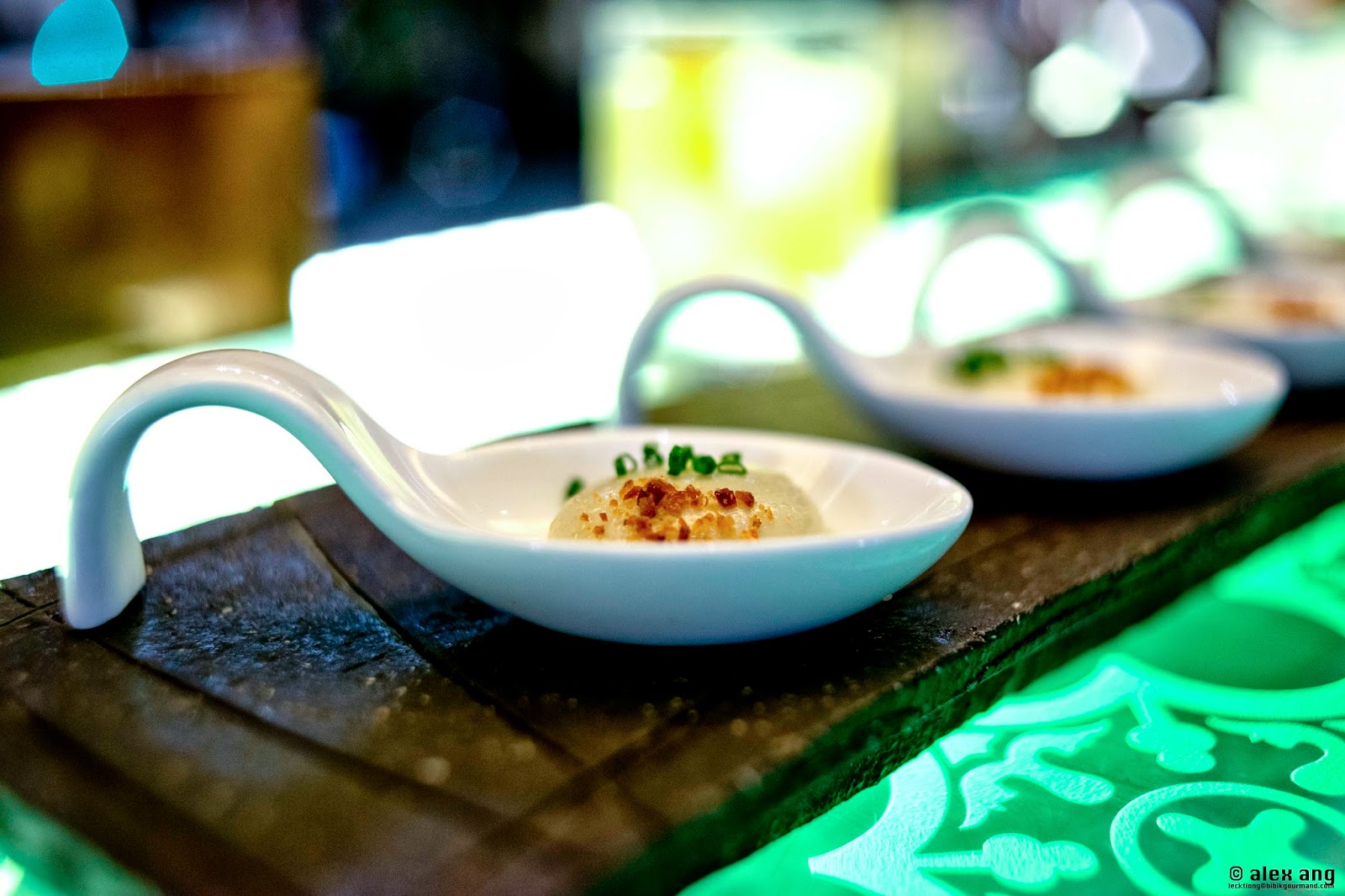 Equally if not more impressive, clam sphere (S$13) offers heart-warming comfort of light and dreamy clam chowder-like broth encased in a sphere topped with crispy bacon bits and a drizzle of parsley oil.