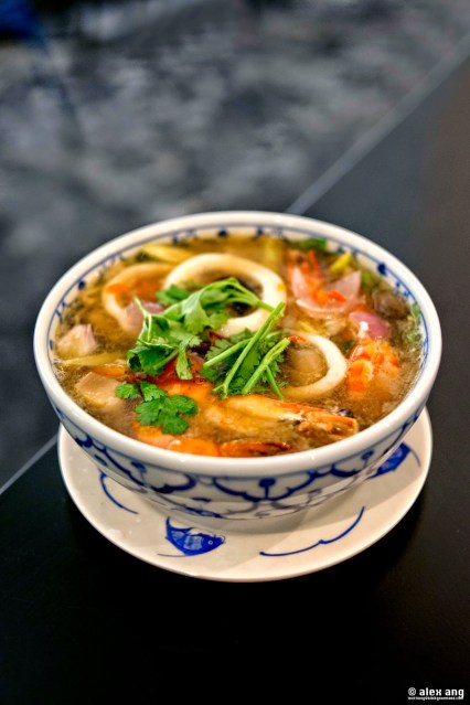 Tongue-searing clear tom yum soup (S$10.90 for small/S$16.90 for large) strewed with squid and shrimps is guaranteed to clear the sinuses with its supremely hot and sour tones, yet packs a punch with balanced and light flavours.
