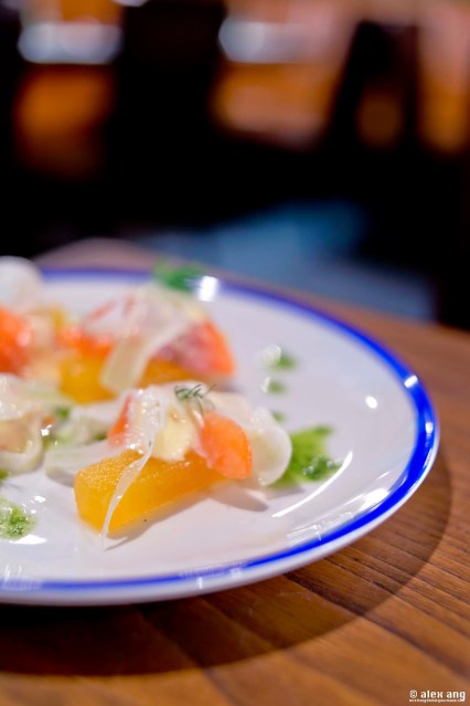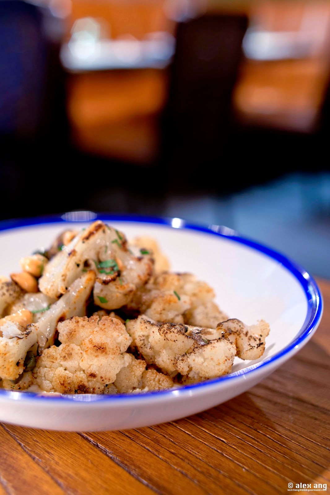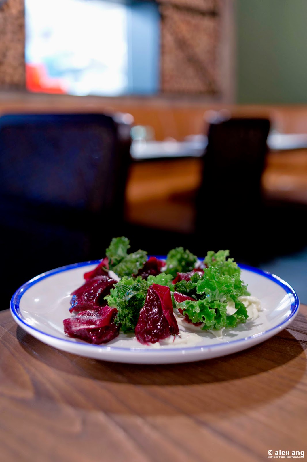 Rainbow trout (S$16++) conjures up bursts of flavours with the marriage of the most unlikely ingredients – a rectangle of watermelon, folds of thinly sliced fennel and a blob of ethereal passionfruit foam. Squares of lipstick-red roasted beetroot (S$10++) with crispy sheets of deep-fried kale on a blanket of mascarpone cheese have a winning depth of flavours matched by textures that are fun to eat. And the grilled tender florets of cauliflower (S$12++) mingle beautifully with flavourful house made bacon, capers and hazelnut with a dollop of crème fraische for an invigorating zing. Grilled Tiger prawns (S$18), also a standout, boasts surprisingly not-so-spicy Szechuan peppers in a simple but stunning preparation of herbed butter and lime.