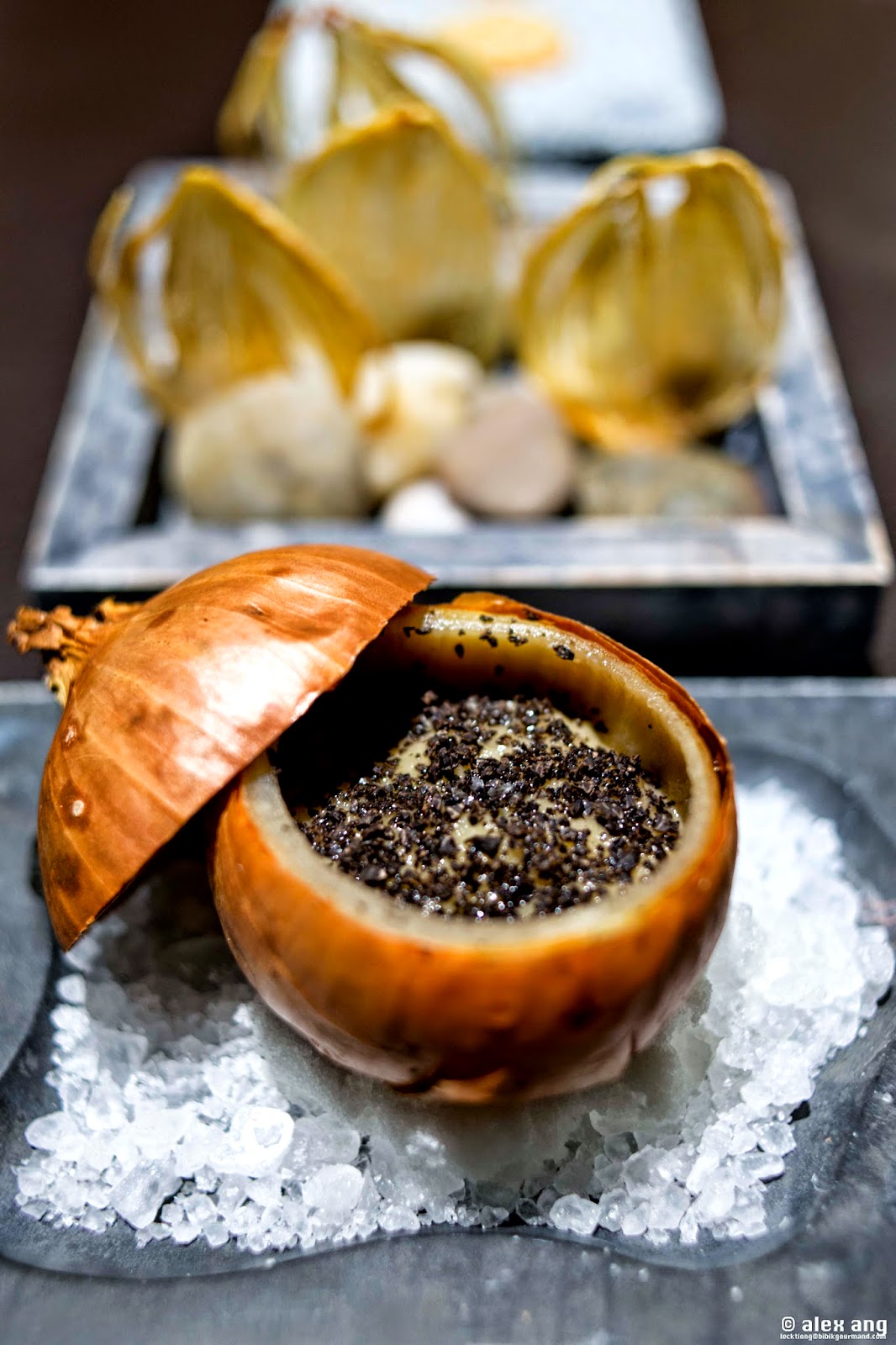 From the Discovery menu, Tan showcases a quarterly-changing interpretation of his favourite vegetable via a mini degustation – Cevennes onion done four ways. First, the mildly sweet onion puree is served with sous-vide egg and topped with grated Manjumup black truffles ensconced in a hollow Cevenne onion shell. A wafer-thin crisp onion tart topped with onion confit and Parmesan follows, as does an onion chip. To conclude, onion tea infused with earl grey-spiked silver needle is served tableside crowned with an emulsion of onion confit.