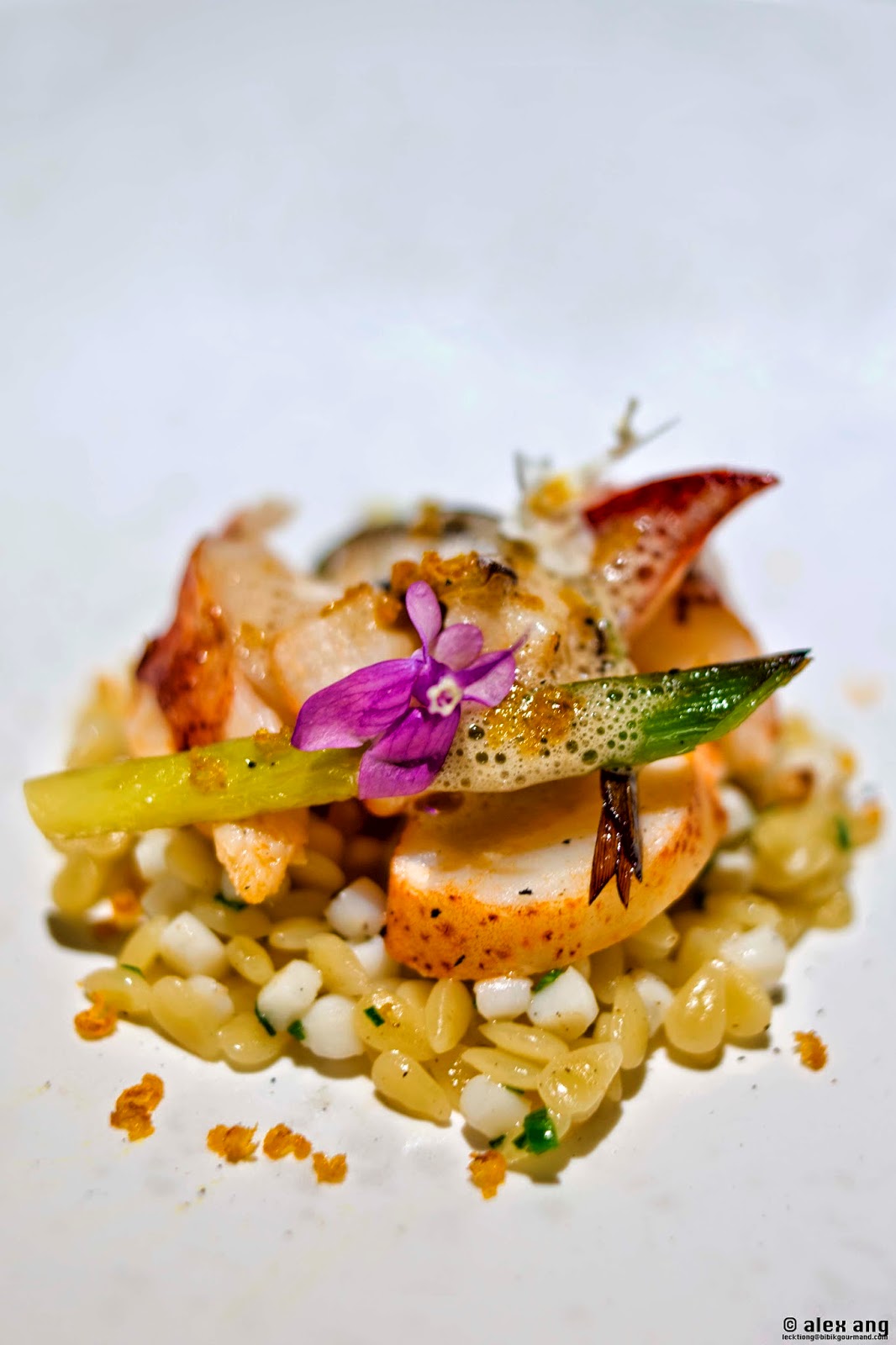 Maine lobster is slow poached and served on a savoury toss of riso pasta, cubed squid and puffed chopped soba. A sliver of burnt leek that tops the dish lends a smoky depth to the mound while a cloud of apple cider emulsion cuts any hint of richness.