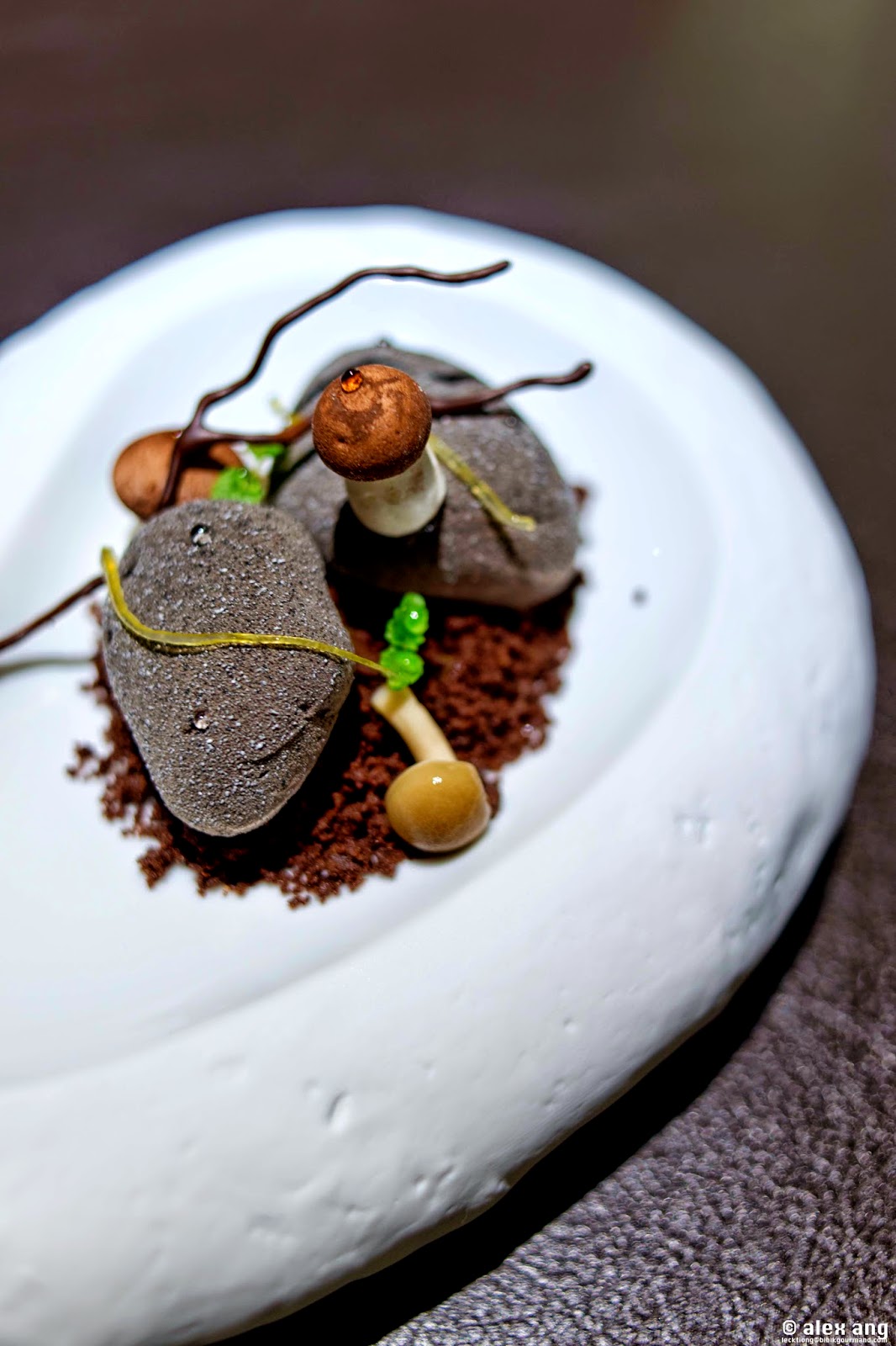 there is no denying that it’s a work of art: lemon curd embedded in cocoa “pebbles” on coarse chocolate soil with mandarin sorbet “shimeji” and shimeji pickled in lemon syrup.
