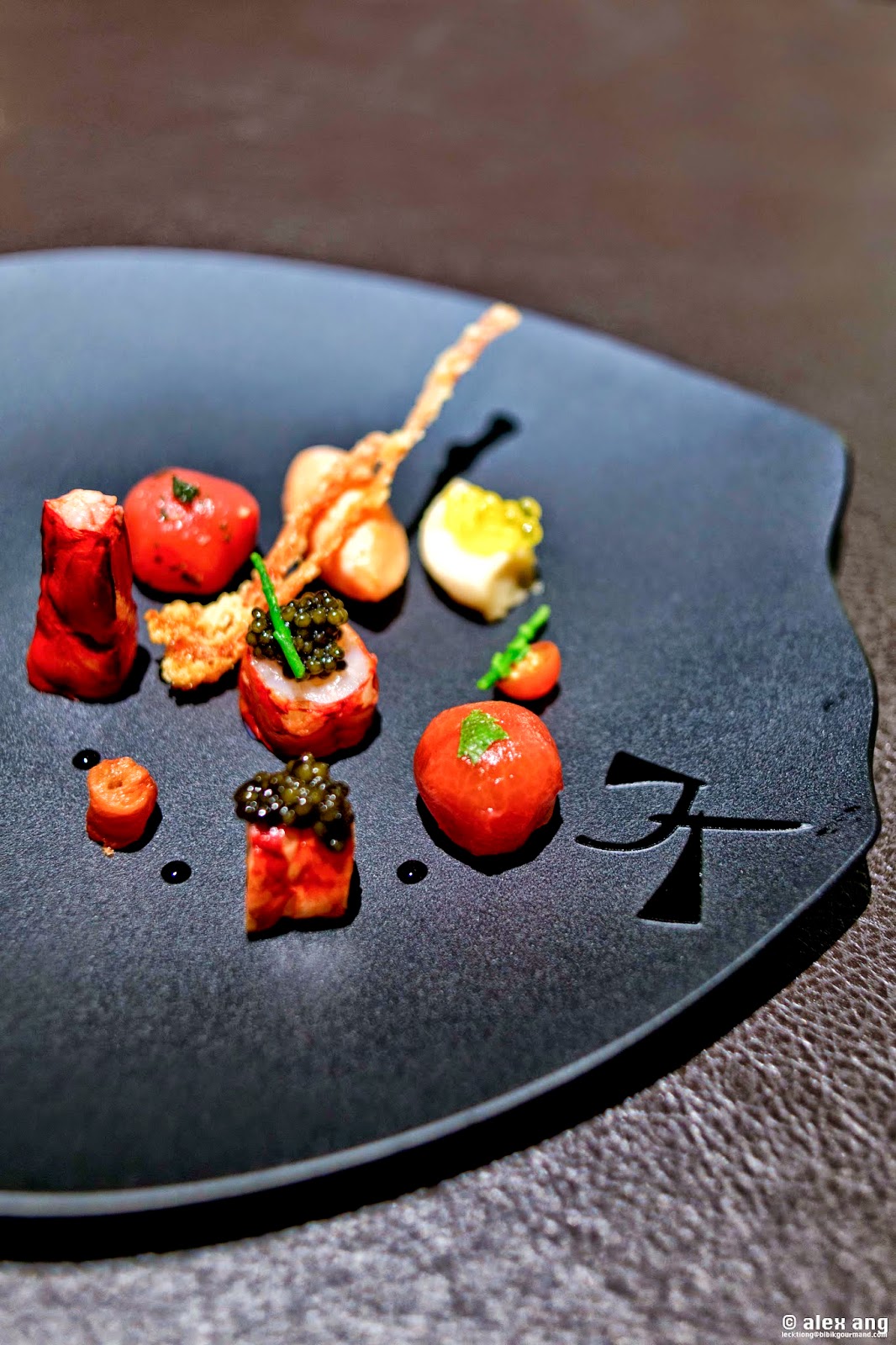Carabinero prawn, a Tan signature, follows. Instead of playing a star role, the Carabinero takes on secondary importance in an artful composition alongside tomatoes in various postures: quenelle of tomato with red capsicum sorbet, tomato cloud topped with olive oil caviar, a whole plum-marinated cherry tomato and a whole cherry tomato marinated in Thai basil and honey. Taking centrestage on the plate is a dramatic display of deep-fried, dehydrated prawn whiskers crowned with Kristal caviar from China.
