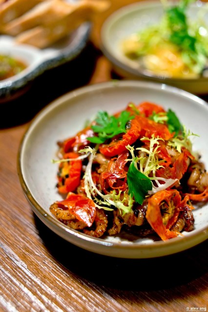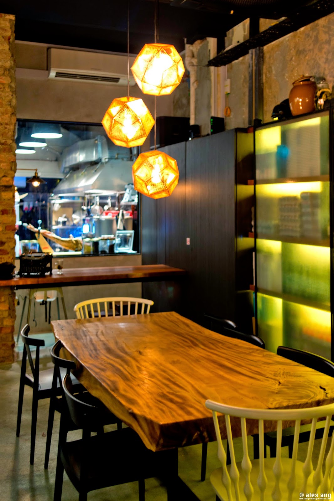 Thanks to one of the owners, who founded Singapore’s foremost designer furniture and lighting boutique, the 60-seat low-lit space is a minimalist stunner. Comprising 3 distinct spaces: a lounge; a main dining area next to a well-stocked bar; and a sua wood communal dining table for bigger groups, the establishment is dotted with branded designer furniture and lightings that will put the vast majority of furniture galleries to shame, think low-slung Eames LCW lounge chairs, Magis Stool_One bar stools and Foscarini Diesel wall lamps. The sand-down walls lined with swatches of railway sleepers and treated corroded steel pieces give the place a rough hewn warmth, balanced by the clean lines of the designer pieces.