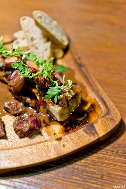 With former L’Atelier de Joel Robuchon sous chef, Martin Wong, helming the semi-open kitchen, the gourmet bar bites are hardly an afterthought. Standouts from our tasting included a salad of baby octopus with chorizo and sundried tomatoes (S$9), a medley of mushrooms with pumpkin puree-stuffed ravioli (S$10) and, if you want mains to share, wagyu cubes on a log of luscious bone marrow (S$28). Also order the crispy pork belly (S$9), a house signature; instead of roasting the tile of meat to perfection, Wong tosses it into a deep fryer after time in the sous-vide machine. It’s not the best we’ve had but it’s worth a try. The smoked duck breast with foie gras teamed with braised lentils and blueberry compote (S$16.80), however, does not do justice to an otherwise smooth-sailing dinner, no thanks to the use of commercially available smoked duck (a hunk of the more pricey magret de canard would have worked magically).