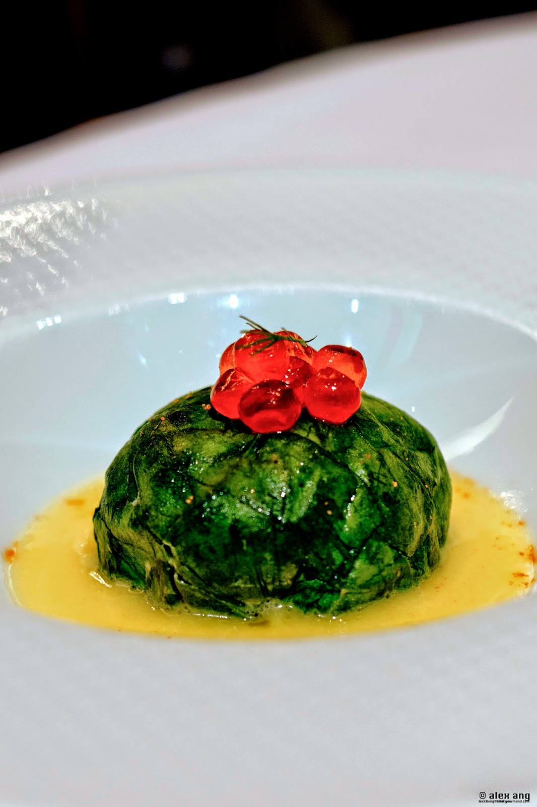 Chunks of succulent Maine lobster mingle with a blend of chopped truffles and langoustine mousse, the parcel arriving enrobed in a layer of gorgeous-green steamed spinach leaf surrounded by fish bone sauce. Matched with ruby-red ikura pearls, it’s visually arresting and even more palate pleasing (think briny, creamy and savoury in a bite).