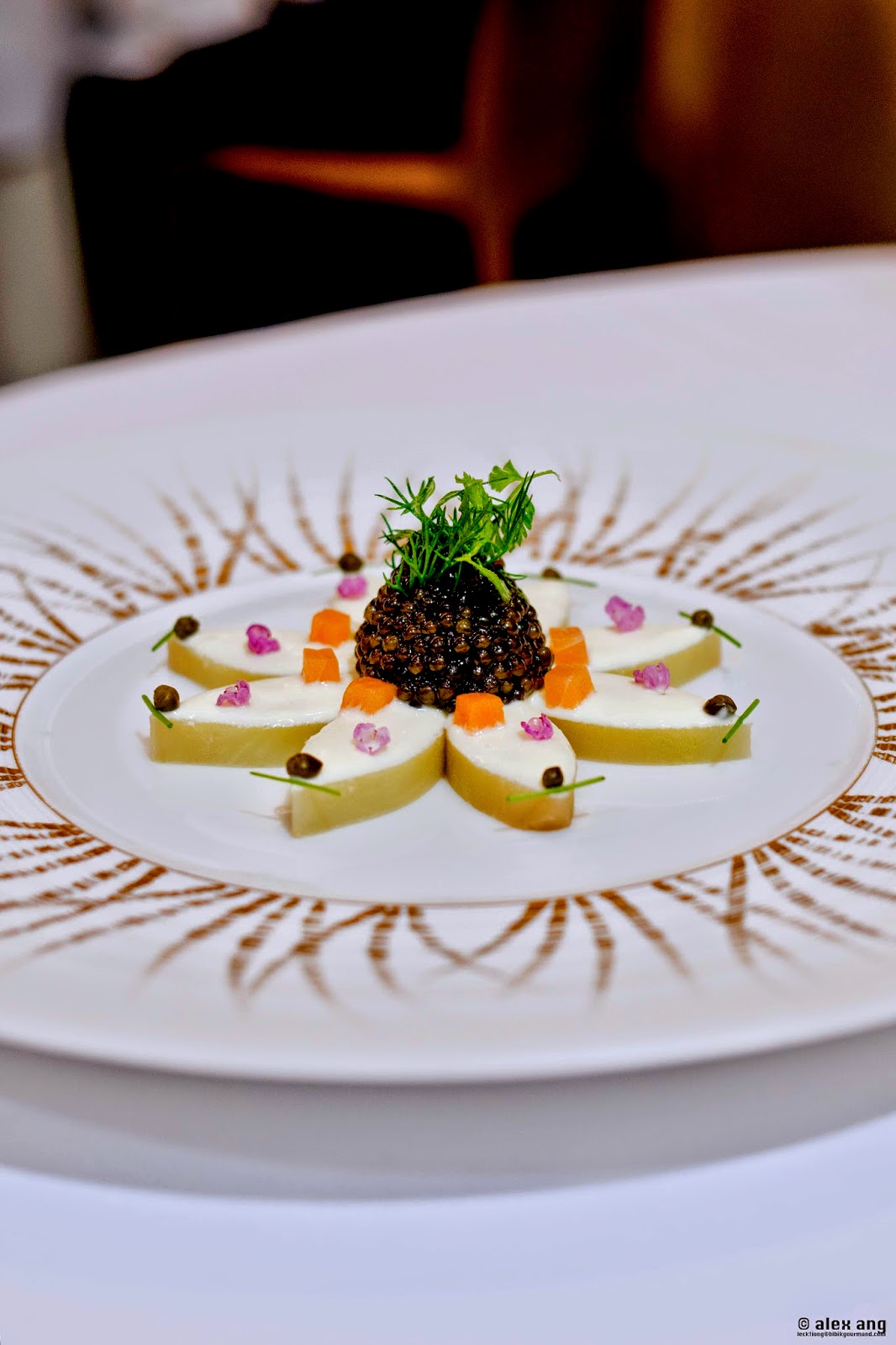 Briny pleasures from the same Kristal caviar sparkle on petals of crème fraiche-glazed Roseval potatoes artfully arranged with shiso flowers and petite squares of salmon.