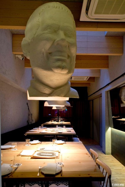 You can’t miss its glistening plate glass door at Hongkong Street, which leads into dim lit digs illuminated by a mélange of quirky lamps crafted from wine decanters and pepper grinders. Pick from a choice of counter seats, banquettes or, further indoors, high stools set in a mirrored inner dining room overhung with “giant head” lamps (similar “giant head” installations are also found in the main dining area tucked high above the counter).