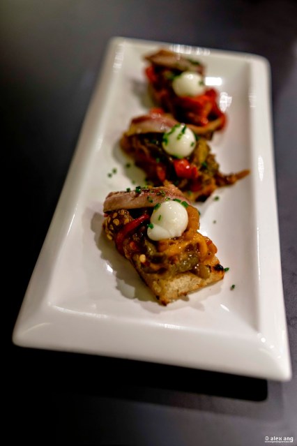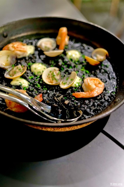 Standouts from the menu include the dizzyingly aromatic smoked olive oil ice cream served with a “gazpacho” (S$12) of watermelon and red capsicum as well as rarely seen mushroom croquettes (S$8 for 4 pieces) set apart from the formulaic lot with intensely savoury button mushrooms within. Whilst we are not fans of wet paella, Noguera’s shallow pan of seafood-crowned black Mediterranean risotto-like “paella” enriched with garlic mayonnaise (S$22) is second only to Binomio’s solid rendition, notwithstanding the absence of socarrat.