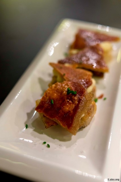 Cauliflower puree sandwiched between a tile of luscious skin-on belly fat and its pork meat (S$14 for 4 pieces) passes muster until you try to tackle the tough suckling pig-like skin that fails to cut. The crispy pork taco (S$14 for 2 pieces), on the other hand, scores for its delicately pulled pork meat encased in deep-fried taco stuffed with a riot of pea shoots.