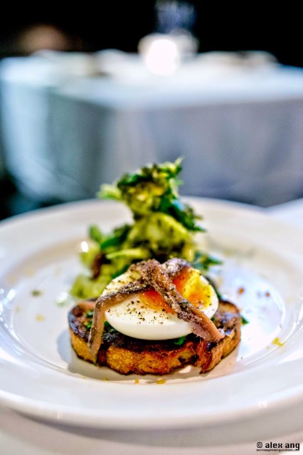 Then, green and yellow wax beans – which are not unlike our string beans – arrived as an Italian rendition of Nicoise salad sans tuna, in a herby thyme vinaigrette with bottarga, crostone (large toasted bread) and half a perfectly cooked onsen egg topped with a piece of lip-smacking Cetara anchovy from Italy.