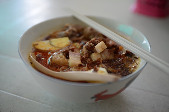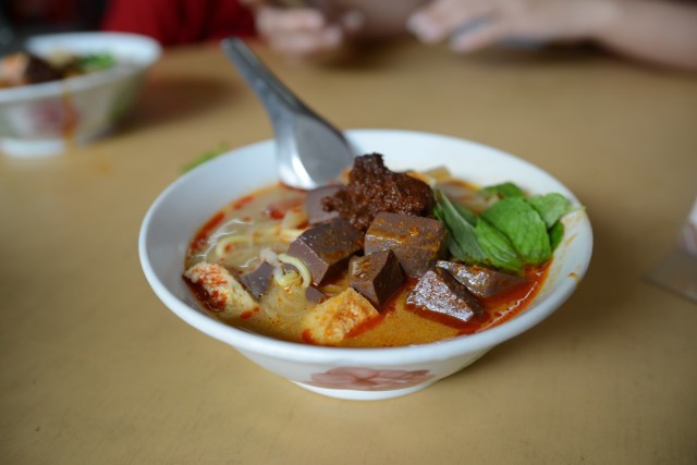 In Penang, kway chap is served with oodles of flat noodles basking in a robust and rich braised duck broth studded with shredded duck meat and pig innards (skin, blood, belly and intestines). For the best, look no further than Mr Poh’s Duck Kuay Chap (Restoran Kimberly, 137 Lebuh Kimberley; 6.35pm to 11pm; closed on Thursdays). Here, every mouthful of the velvety flat noodles accompanied by slices of the accompanying goodies was a cholesterol-busting delight. Note that this stall operates only at night and is located on the same stretch as Tua Pui Curry Mee.