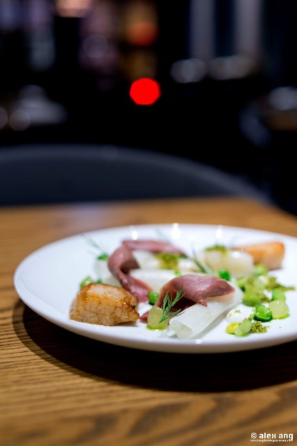 Scottish scallops were served two-ways – grilled and raw – with house cured duck ham, folds of thinly sliced kohlrabi and balls of uncooked English peas. It was a good dish but not perfect. Much as we loved the sheerness of the ingredients, the dish could benefit from some hydration, be it a drizzle of olive oil or a dash of light dressing.