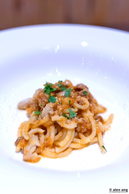 | Bigoli pasta, iberico pork ragout, peanuts, Parmesan cheese |