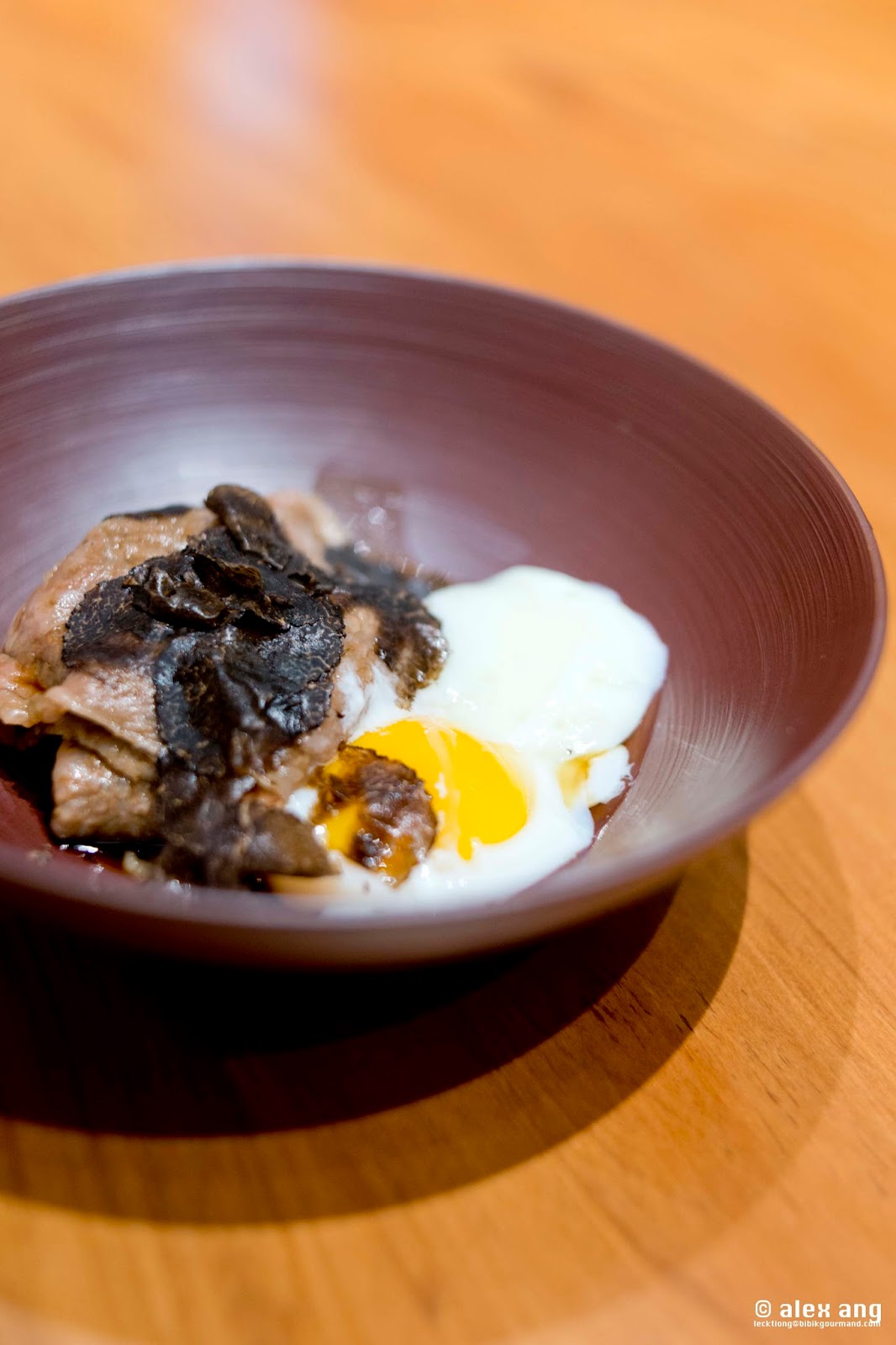 The dinner cruises on ascendo from here. “Rosanjin” style sukiyaki arrives with paper-thin slices of Ozaki wagyu loin blanched briefly in a warm bath of 3 month-old sukiyaki sauce prepped with Miyazaki shoyu. It is served with a dollop of perfectly formed slow-cooked egg rained over with generous shavings of Perigord truffle and just enough sukiyaki sauce to envelop the palate with umami. (4.5/5)