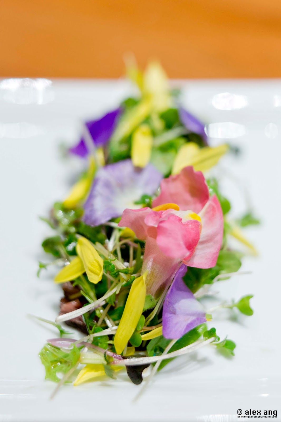 There is also a course of “roast beef” slices in herb garden. Technically a braised beef dish that bears a strong physical resemblance to roast beef, the meat is first seared then slow cooked in a cocktail of shoyu and red wine. Before serving, it is sliced and buried completely in a riot of 15 different types of herbs and edible flowers drizzled with balsamic vinegar and a dash of braising liquid. It’s not my favourite course of the meal but it passes muster. (3.5/5)