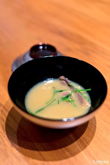 The opening act from the Ushidoki course starts light with a slab of fork-tender beef tongue basking in a sweet and heartwarming bath of white miso broth. In case you’re wondering, Japanese offals are not approved for importation into Singapore at the moment and Hirohashi uses American beef tongue for this dish. (3.75/5)