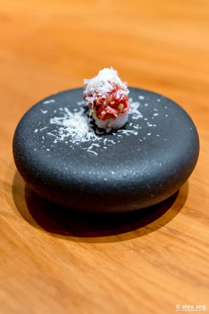 The momentum plummets with the sushi course – Ozaki beef tartare prepared Korean yukke style, i.e. seasoned with shoyu and sesame oil, arrives as sushi on hand-pressed shari. Showered with grated Parmesan cheese at the table, the clash of flavours is, to put it not so lightly, brazen. The idea of serving the Ozaki beef yukke holds strong potential though. (2.75/5)