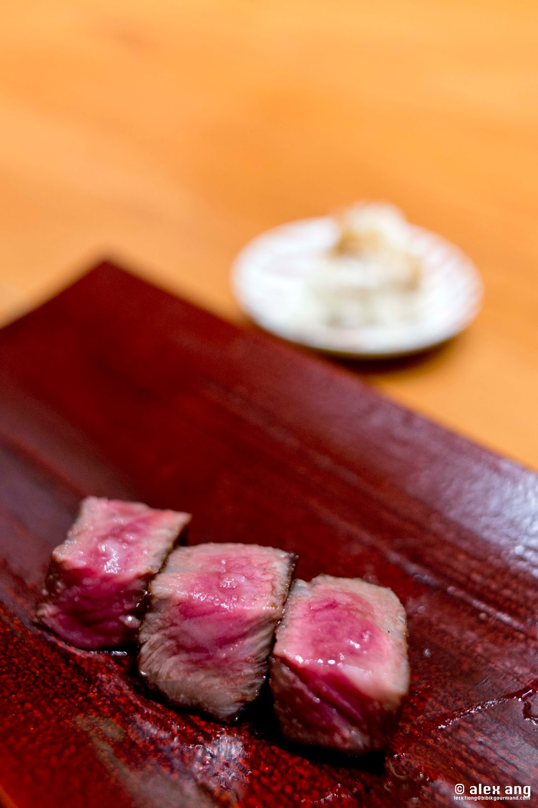 Char-grilled Ozaki beef two ways is also a delight. Beefy-with-a-good-bite uchi momo (a cut of lean wagyu from the inner thigh) is served with garlic chips and freshly grated wasabi; and melt-in-the-mouth sirloin with shoyu-drizzled horseradish. Both are grilled by the counter on bincho and served rare but still tender and succulent with a hint of smoky tang alongside sauteed seasonal vegetables. (4.5/5)