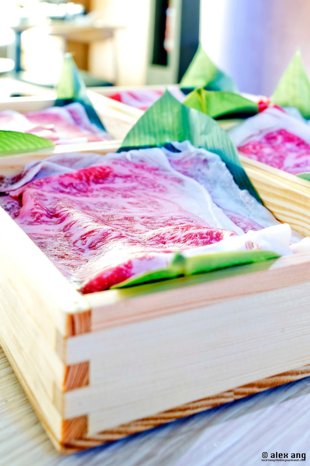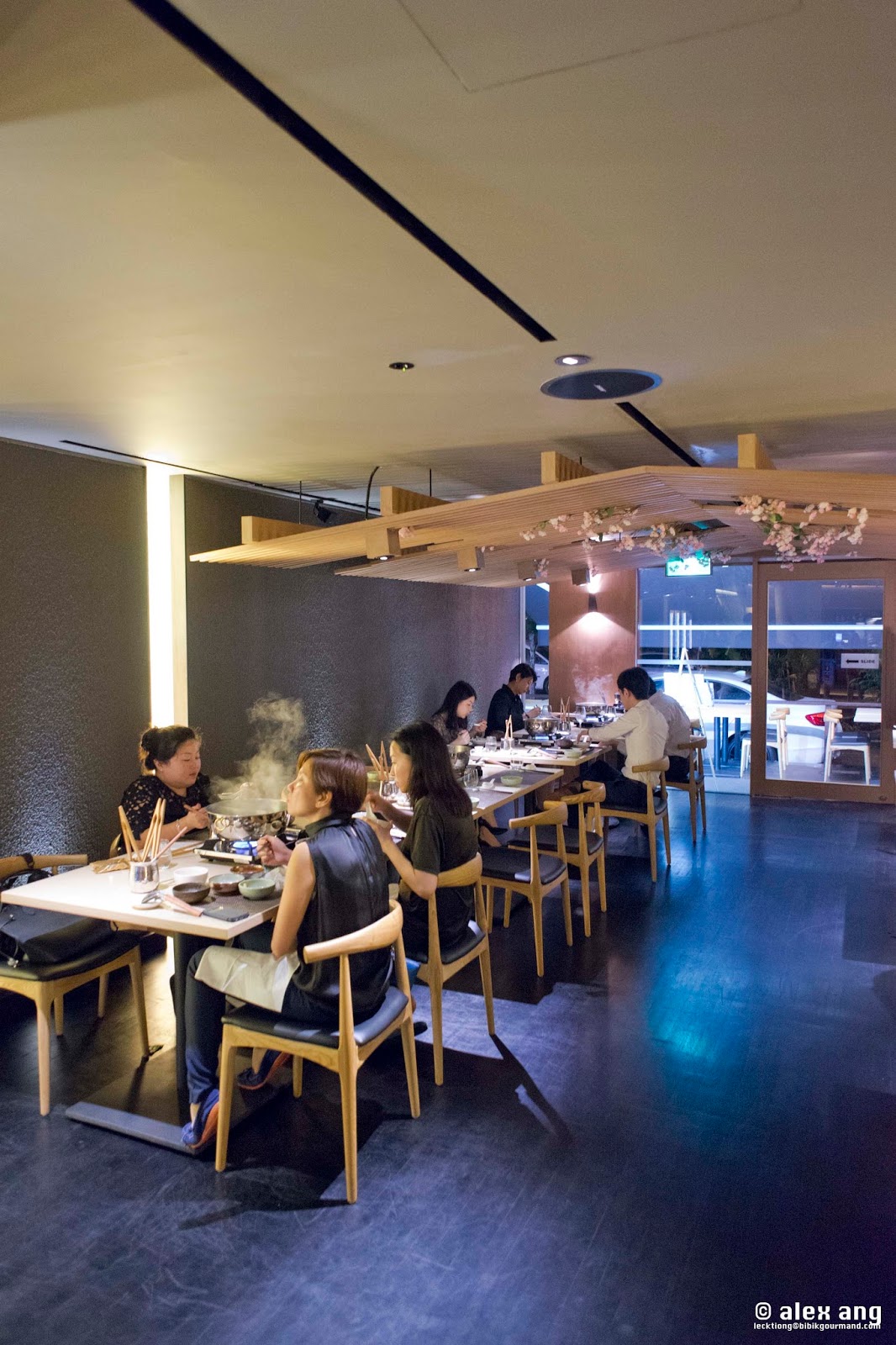 As a testament to its draw, upscale shabu shabu-sukiyaki-kakigori joint, Sakurazaka, quietly debuted in the balmy estate weeks back with plate glass doors offering passersby a peek of its refined light wood interior. While its look-and-feel complete with low-slung chairs and a set of slated wood ceiling flecked with sakura flowers is fittingly Japanese, this is no ordinary shabu shabu joint.
